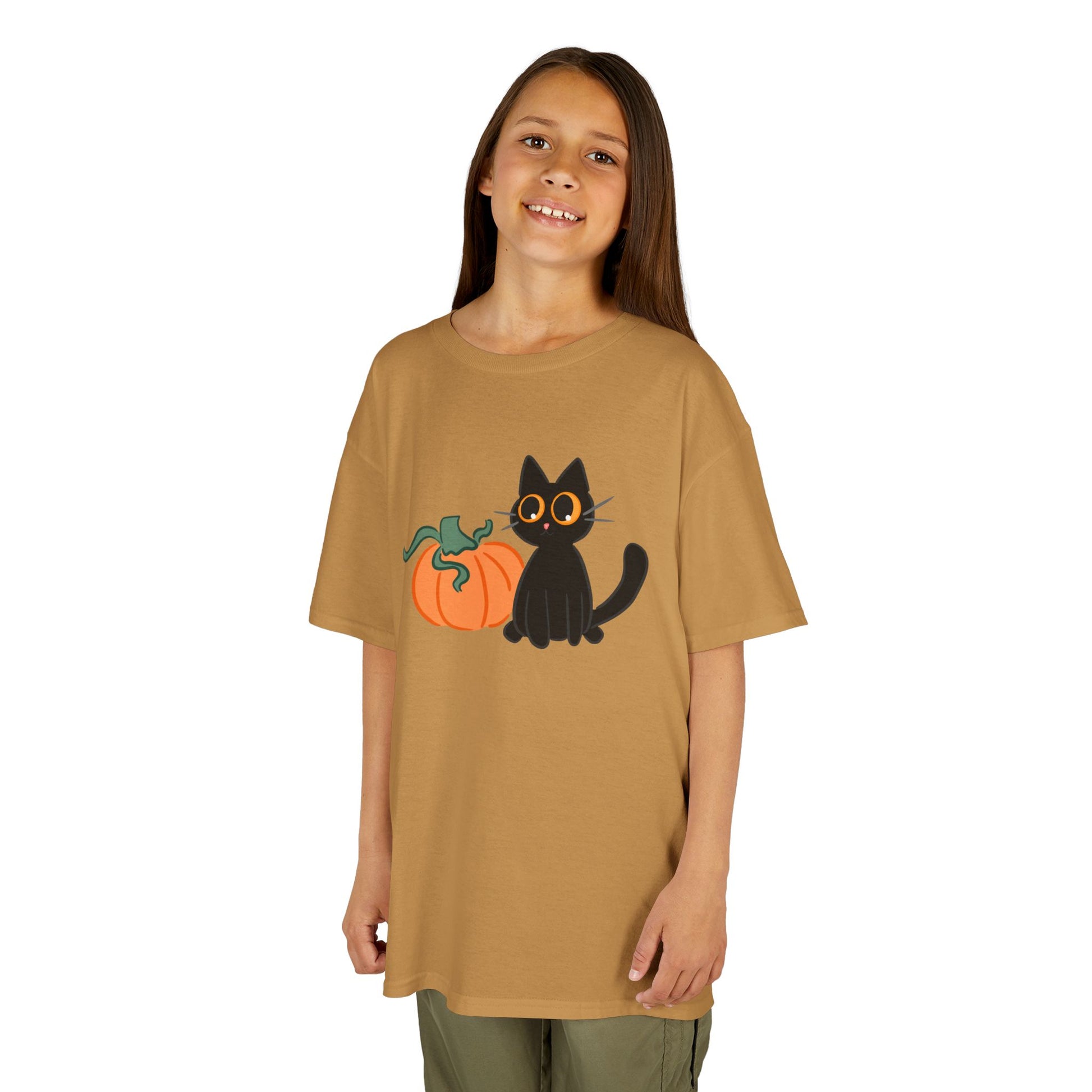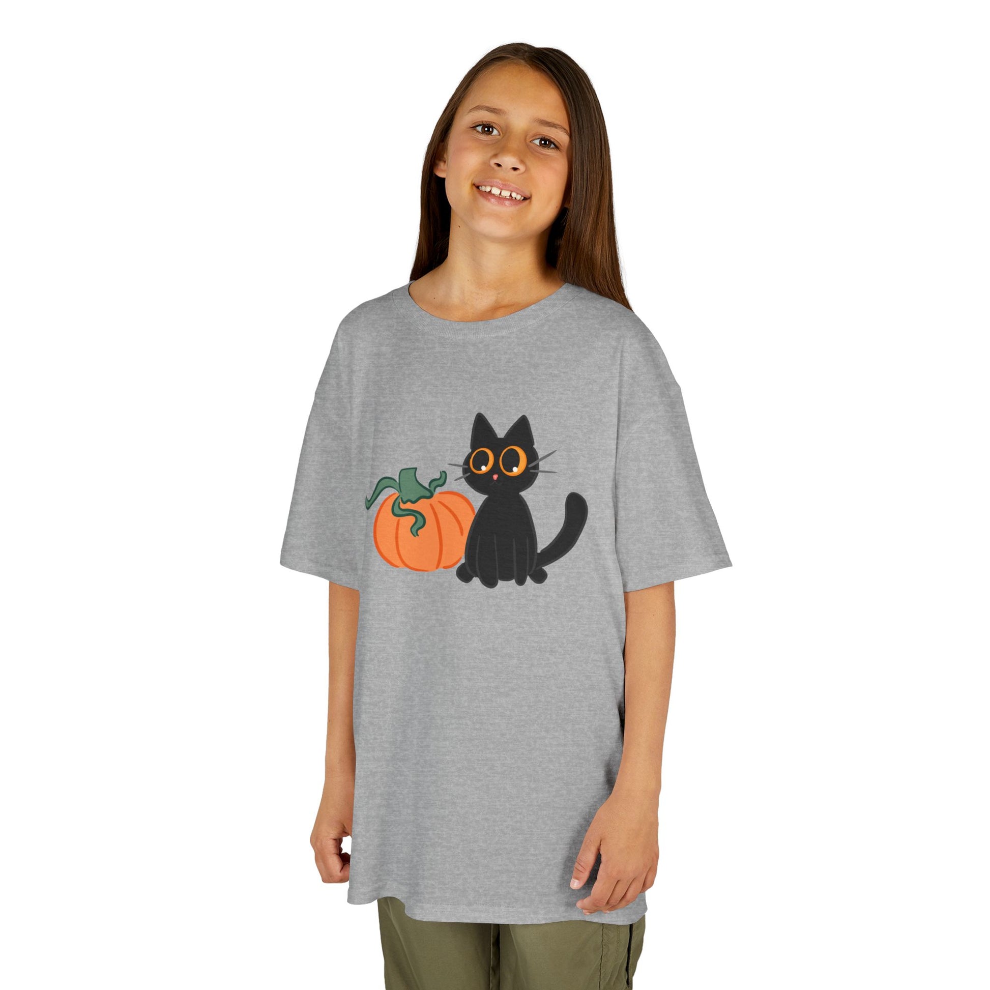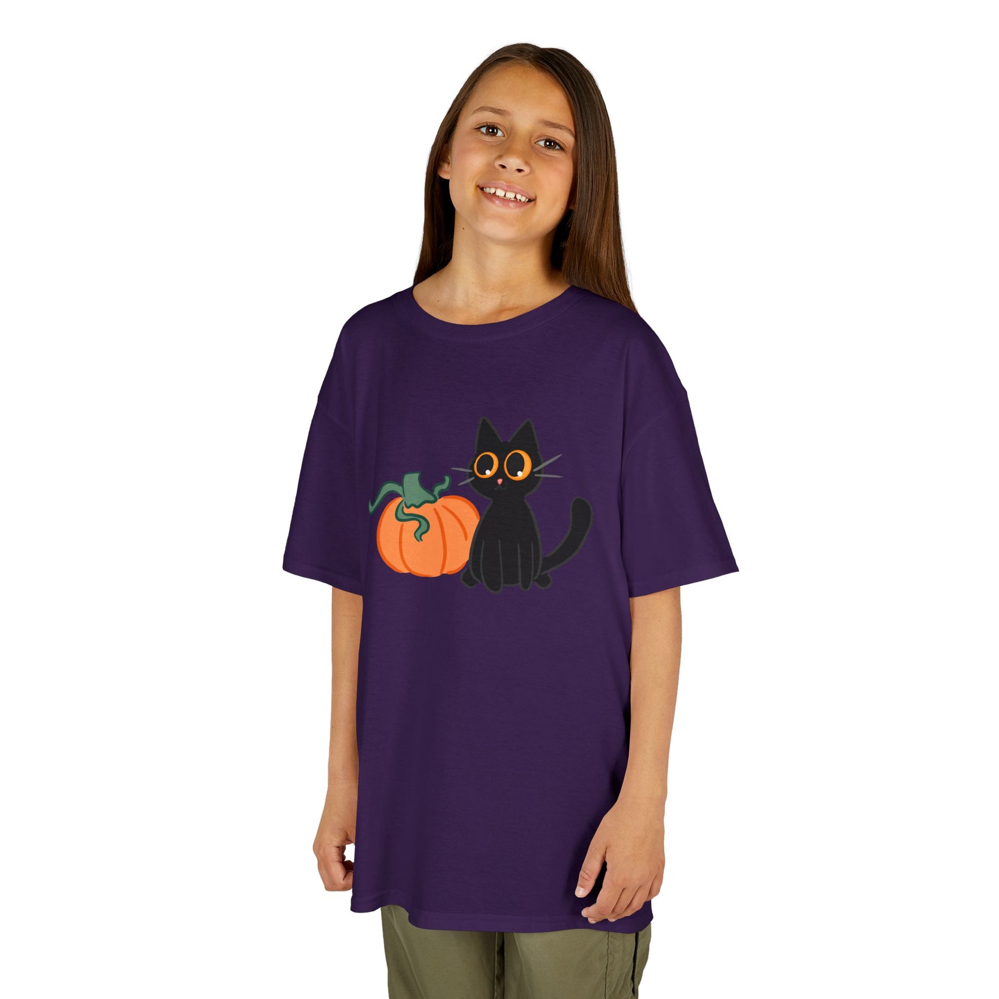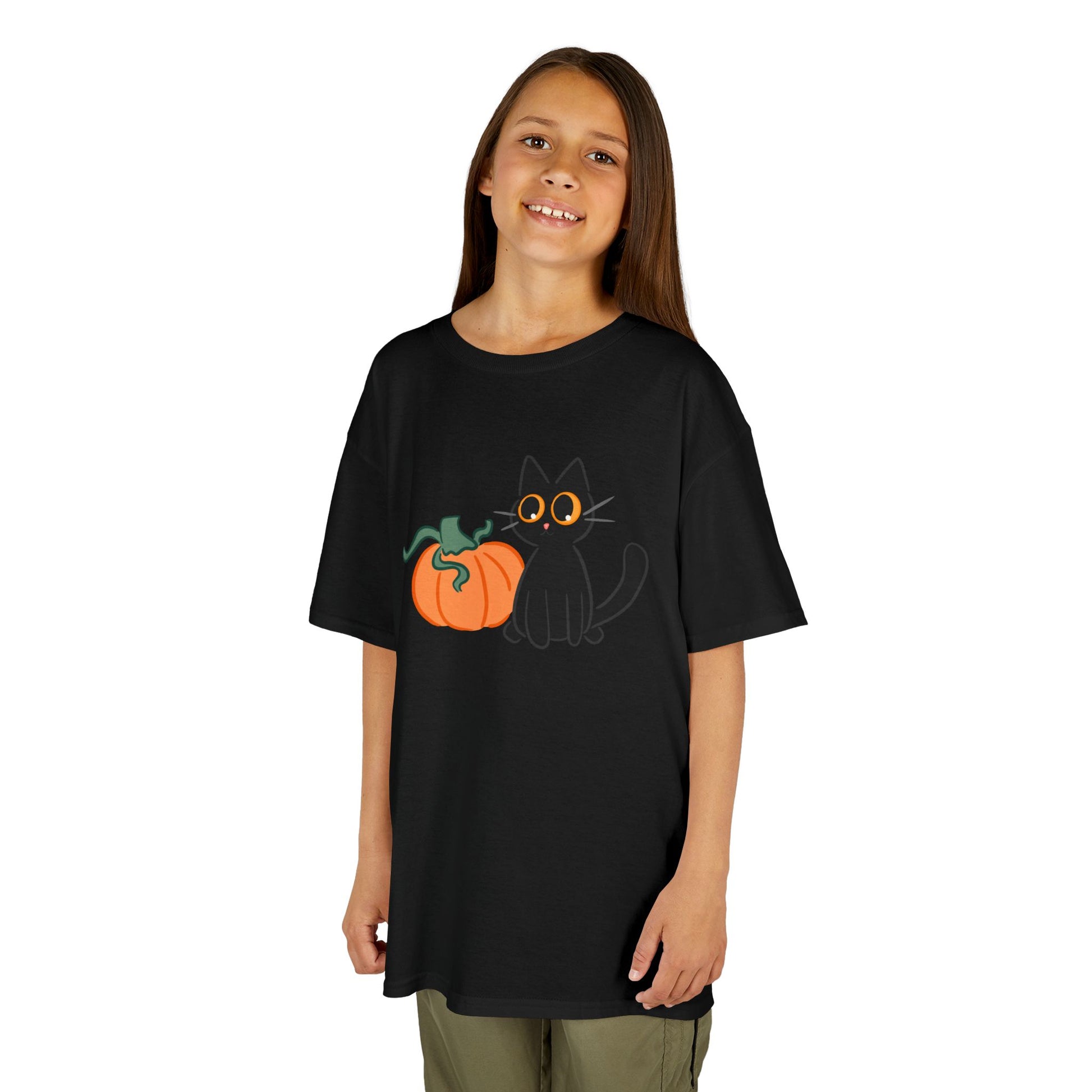 This charming Kids Heavy Cotton™ Tee features an adorable black cat beside a cheerful pumpkin, perfect for young ones who love all things festive and fun. The soft cotton fabric ensures comfort for daily wear, making it a delightful addition to any child's wardrobe. Whether it’s for Halloween, a fall festival, or just casual outings, this tee brings a playful vibe that kids will love. Ideal for trick-or-treating or pumpkin picking, it’s suited for little animal lovers and aspiring young witches alike! Parents will appreciate the quality and ethical production behind this garment, knowing it’s made from responsibly sourced materials. Dress your kids in this cute tee to celebrate autumn with style!
