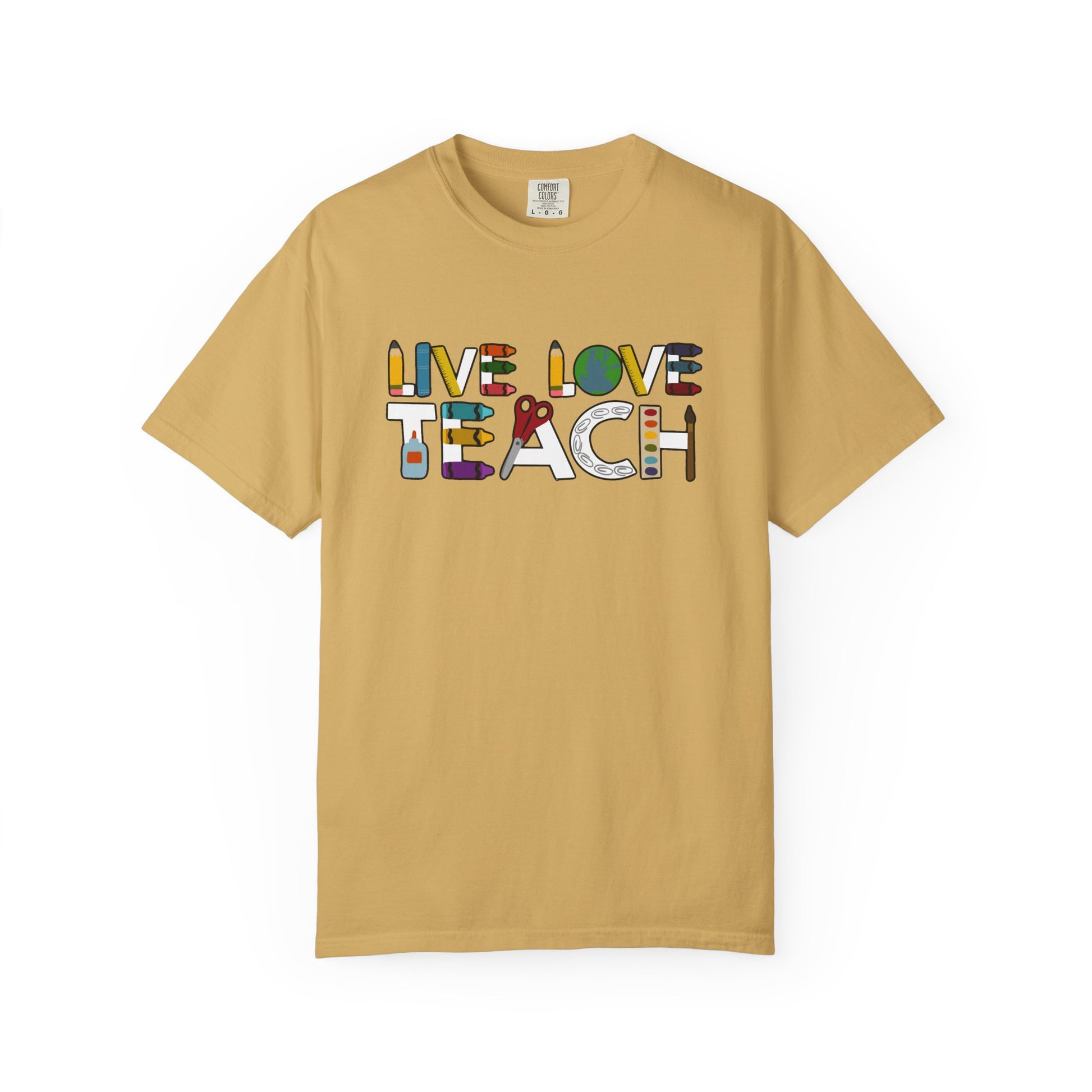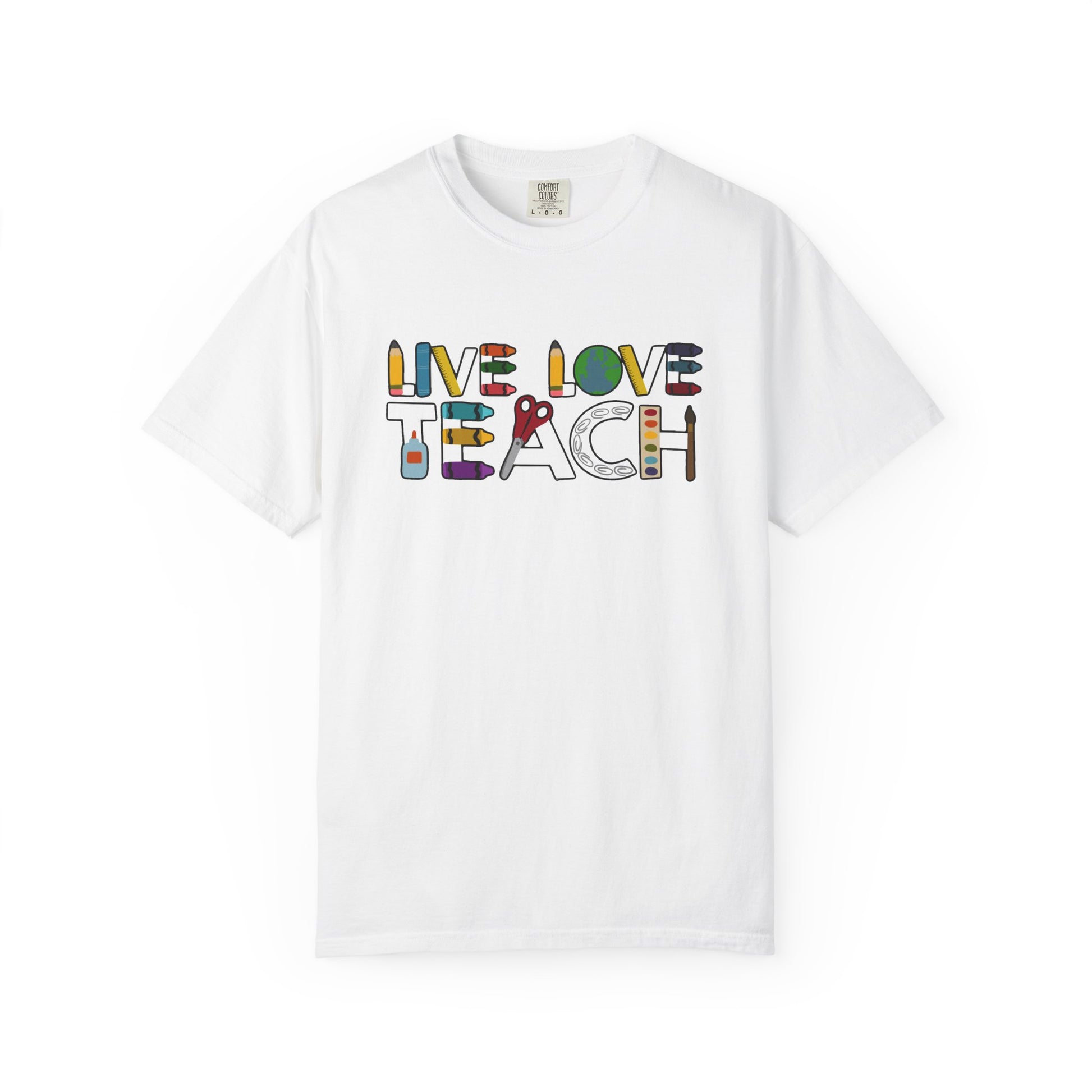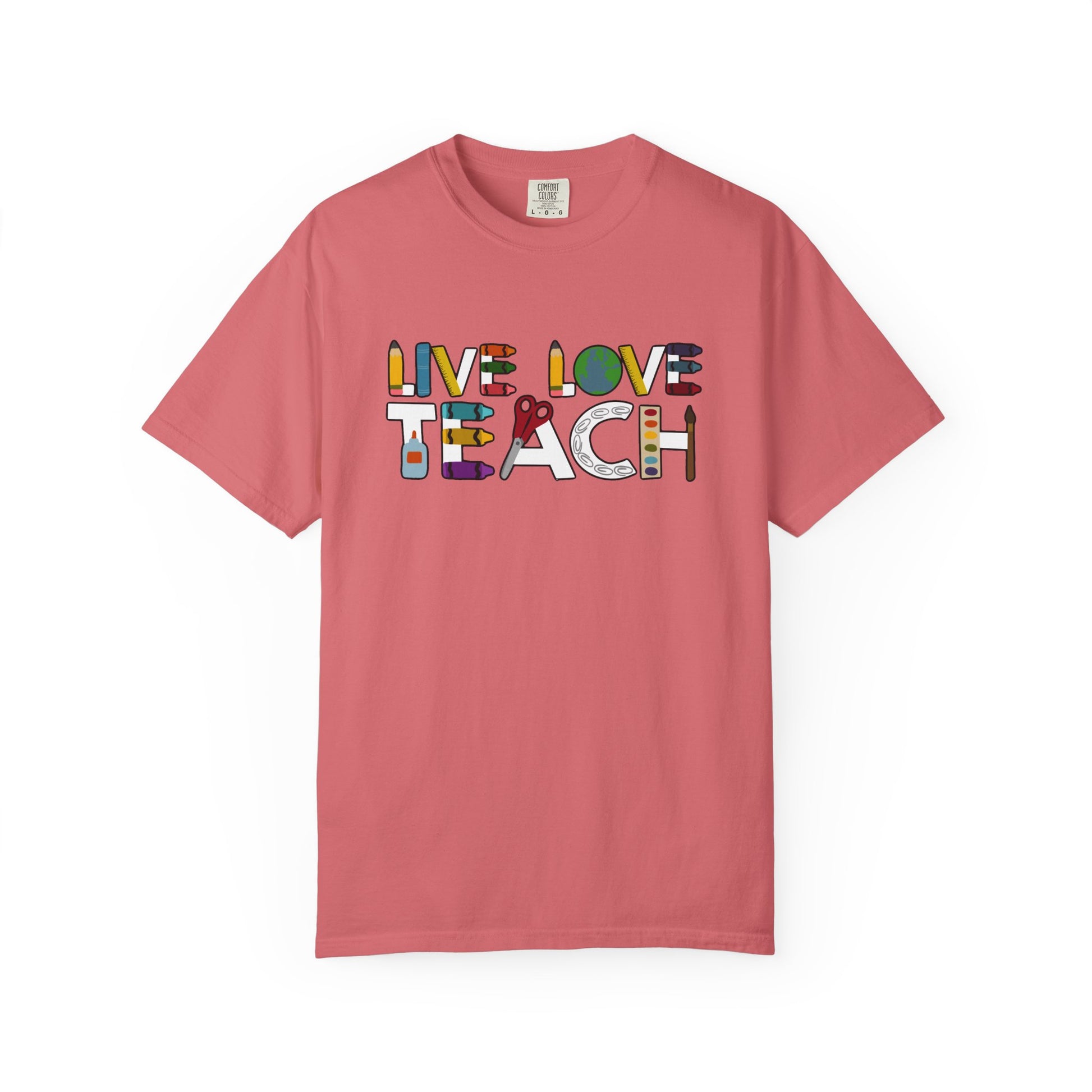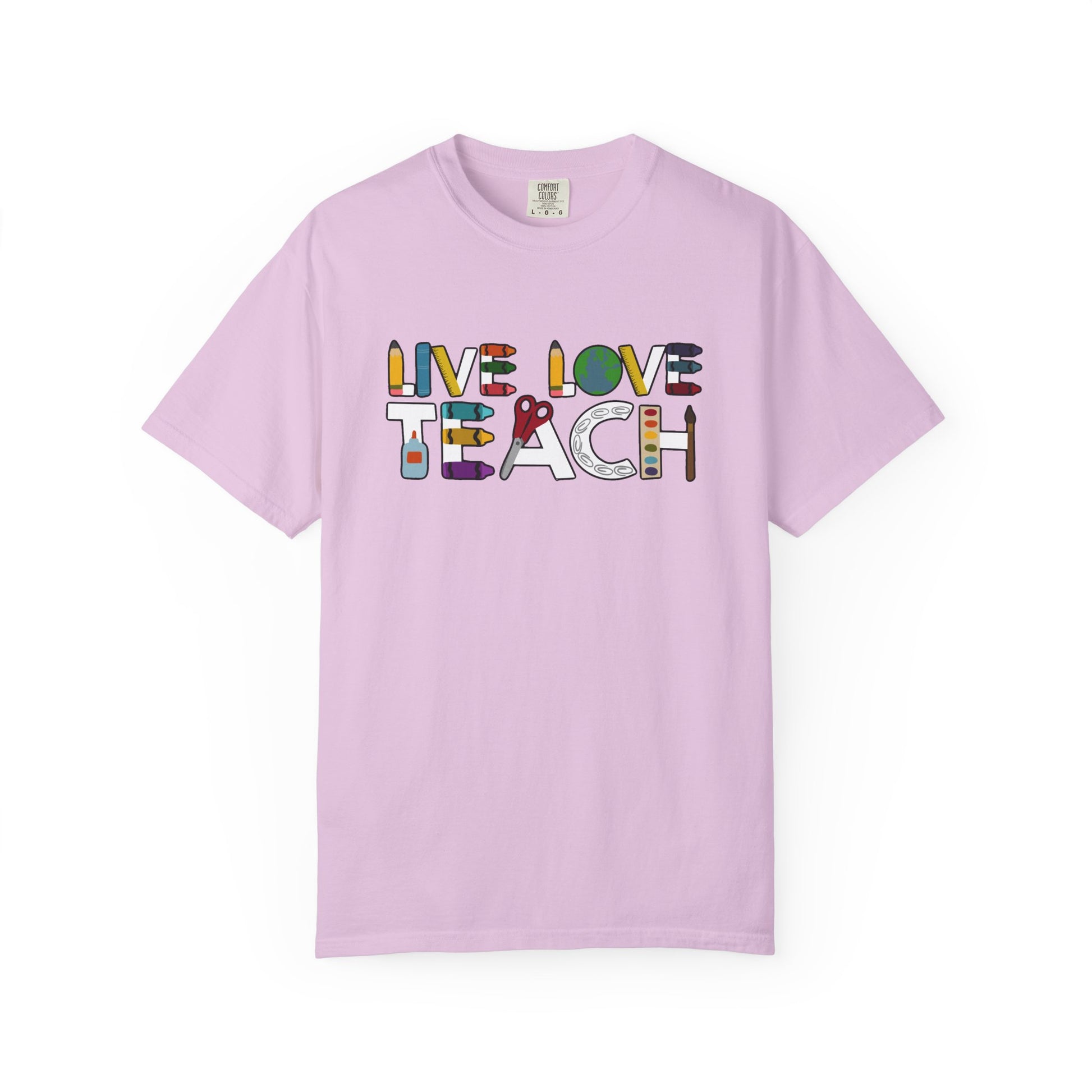 Introducing a versatile Unisex Garment-Dyed T-shirt that combines comfort with a creative message. Sporting the vibrant phrase "LIVE LOVE TEACH," this tee radiates positivity and is perfect for teachers, educators, and advocates of love and community. Its relaxed fit and soft fabric provide an inviting atmosphere, making it ideal for casual outings or cozy gatherings. Whether celebrating Teacher Appreciation Week, World Teachers' Day, or simply enjoying everyday life, this shirt enhances any wardrobe with its laid-back style. Available in a palette of 58 stunning colors, it encourages self-expression and personal style. A staple for anyone looking to promote love, life, and education!