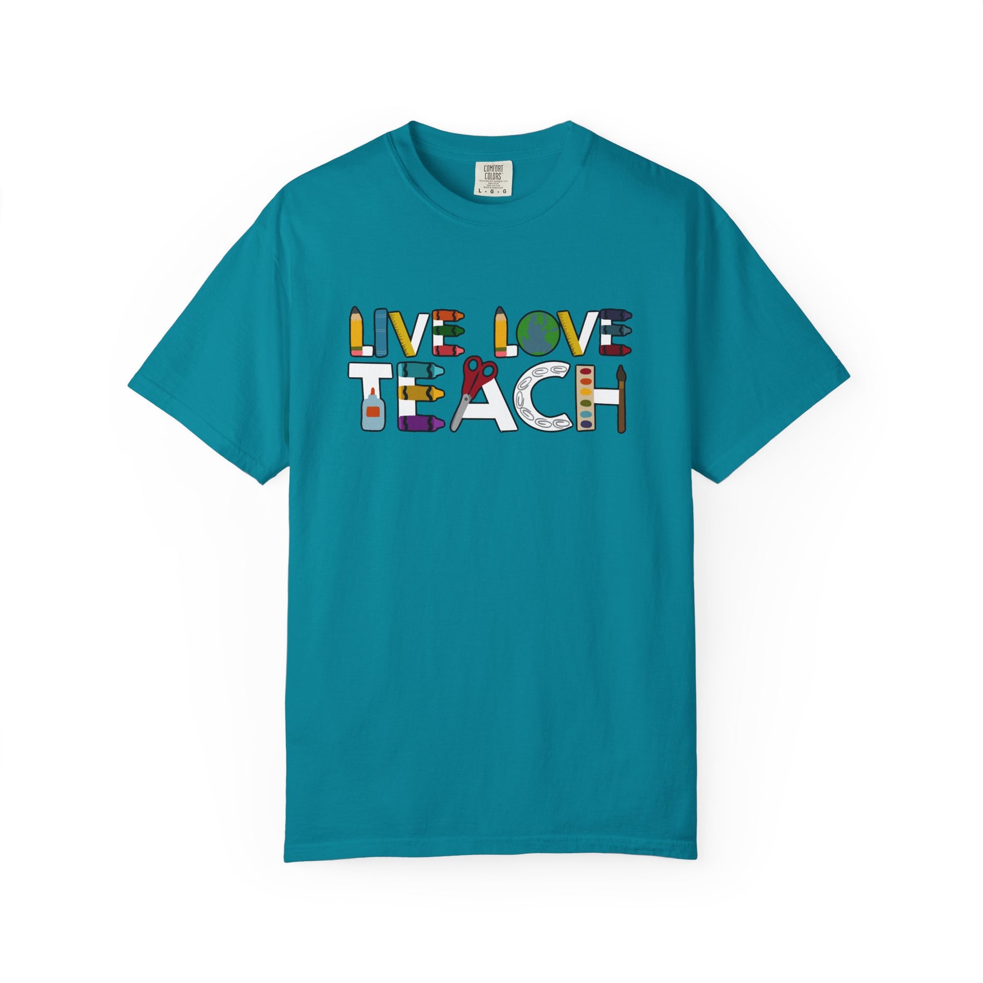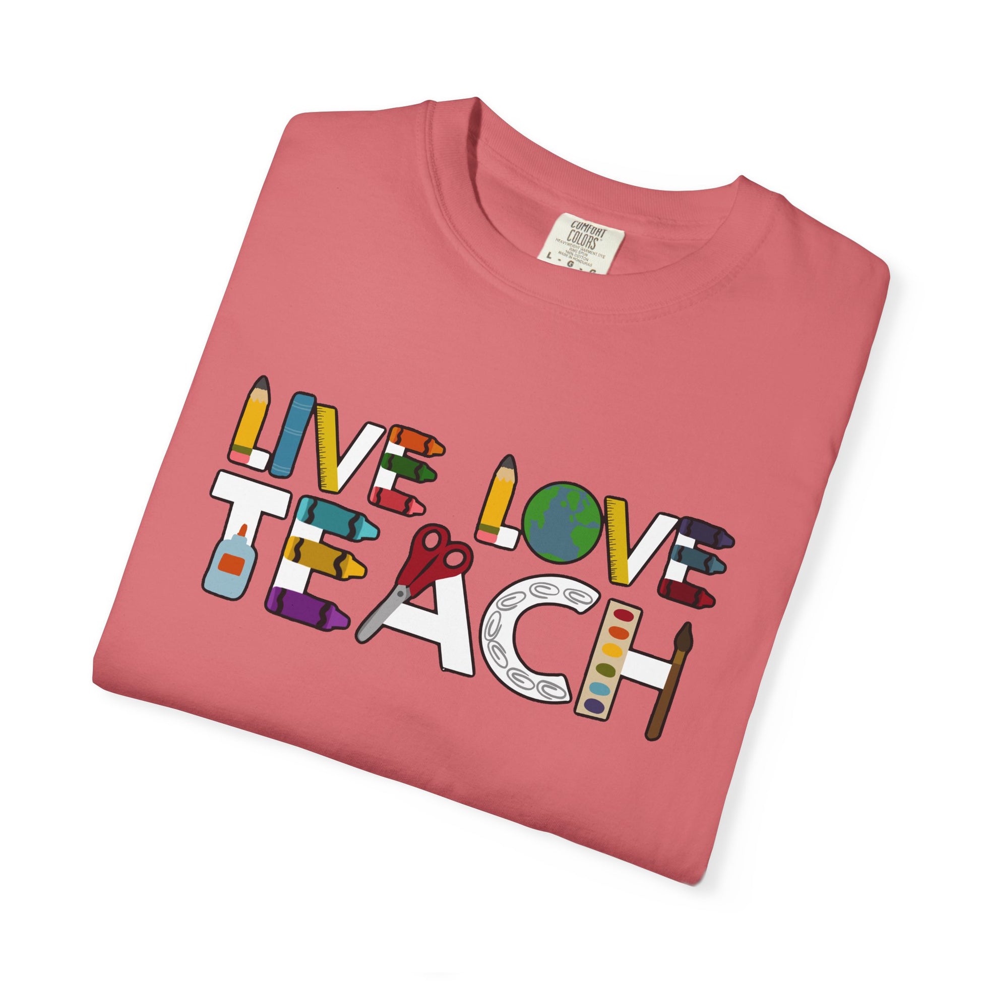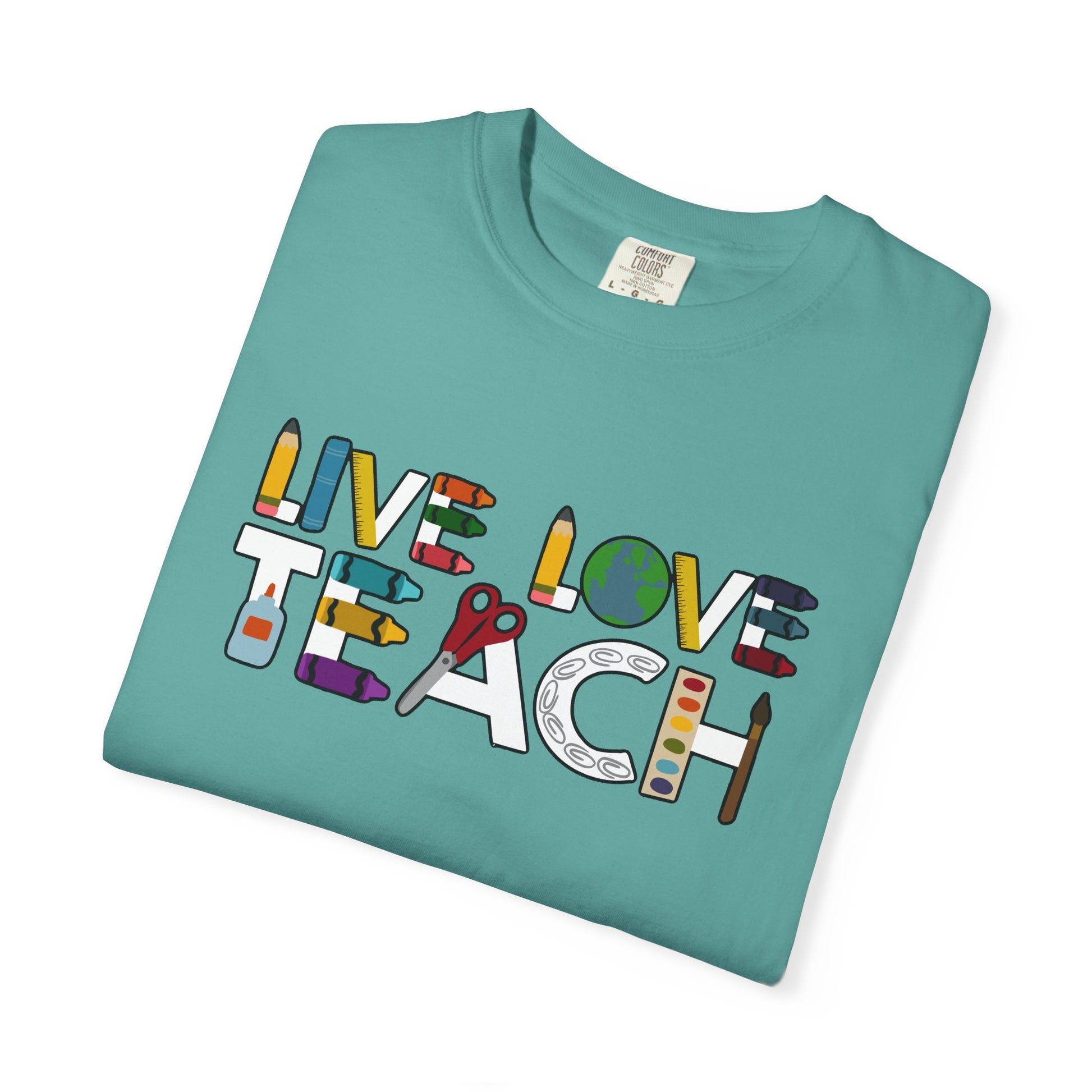 Introducing a versatile Unisex Garment-Dyed T-shirt that combines comfort with a creative message. Sporting the vibrant phrase "LIVE LOVE TEACH," this tee radiates positivity and is perfect for teachers, educators, and advocates of love and community. Its relaxed fit and soft fabric provide an inviting atmosphere, making it ideal for casual outings or cozy gatherings. Whether celebrating Teacher Appreciation Week, World Teachers' Day, or simply enjoying everyday life, this shirt enhances any wardrobe with its laid-back style. Available in a palette of 58 stunning colors, it encourages self-expression and personal style. A staple for anyone looking to promote love, life, and education!