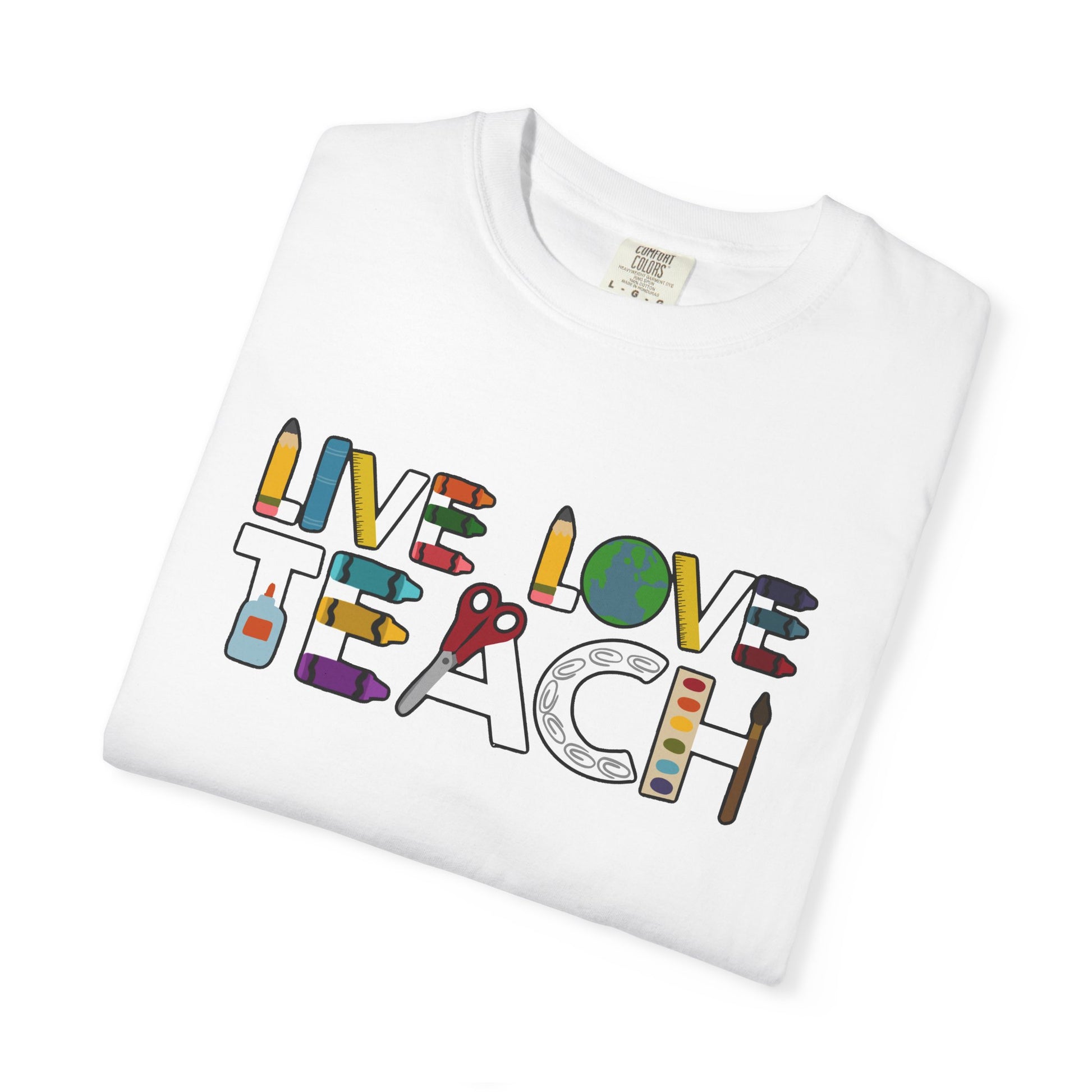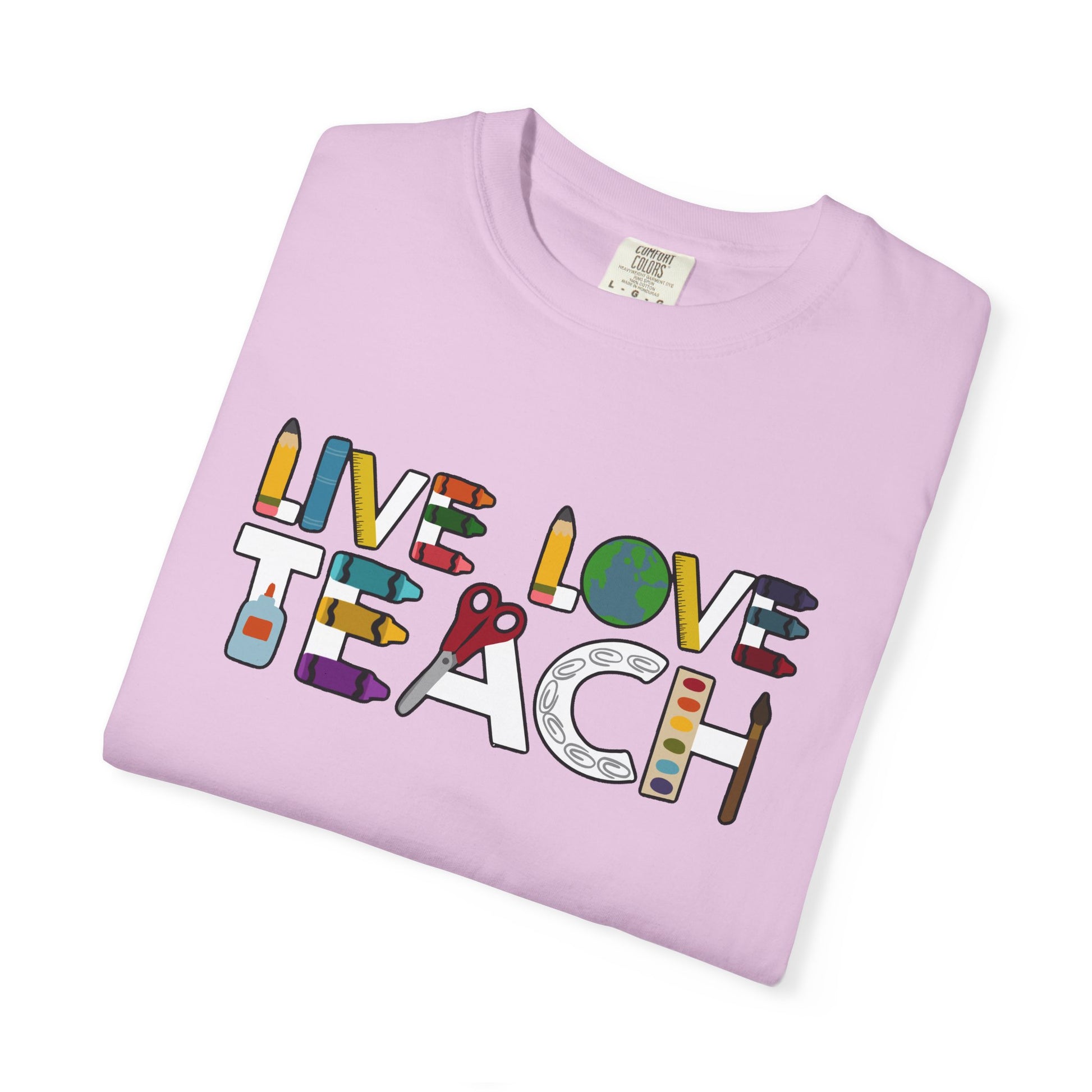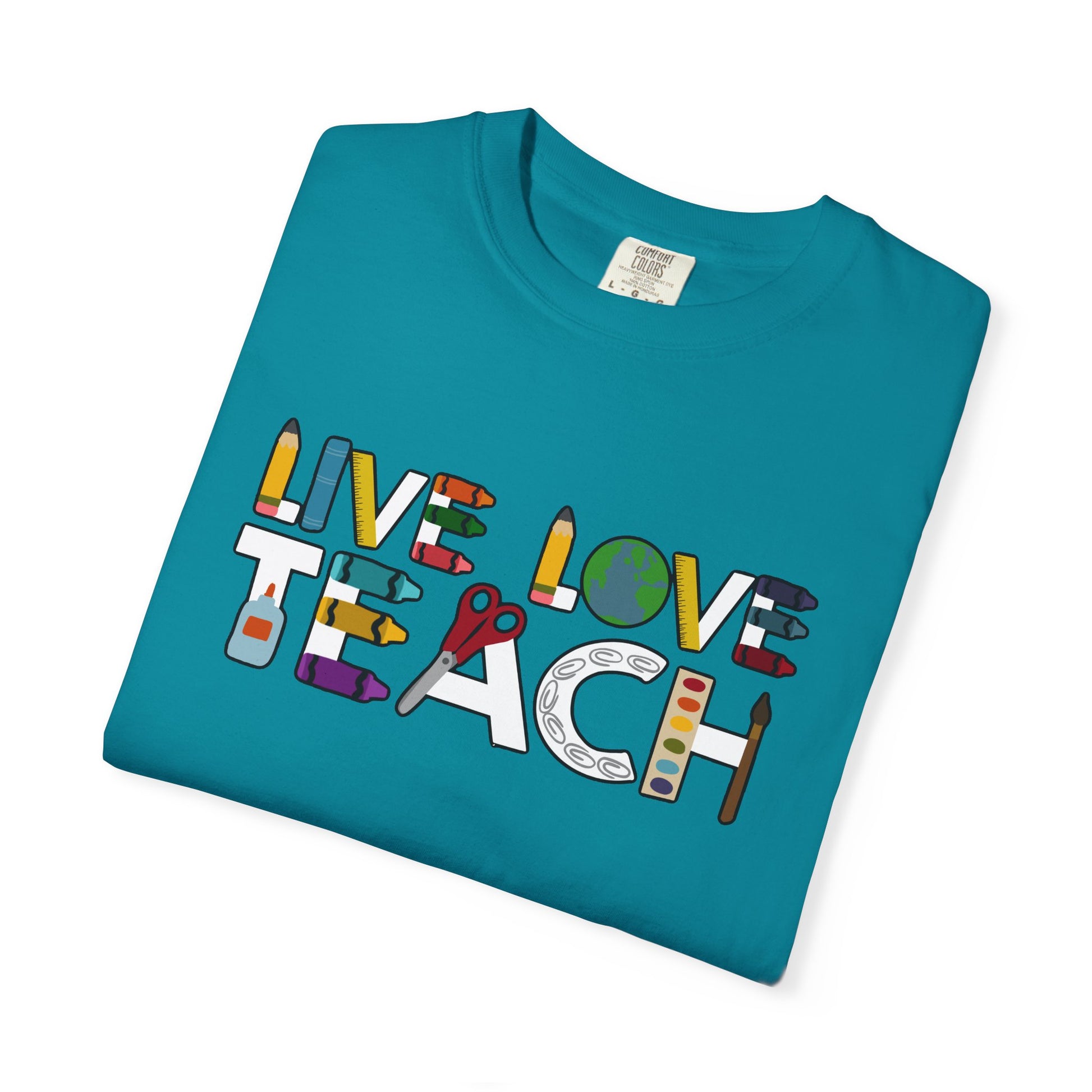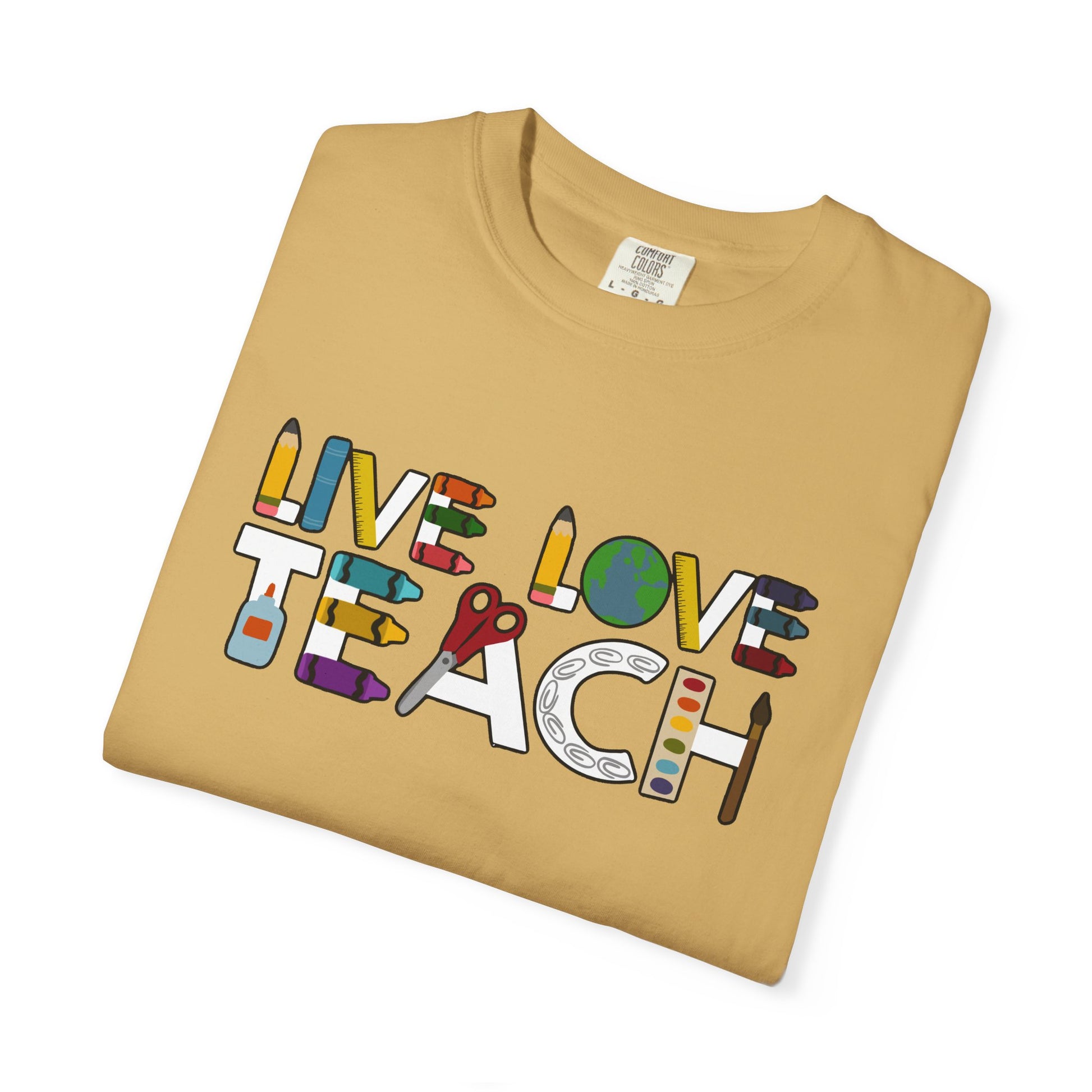 Introducing a versatile Unisex Garment-Dyed T-shirt that combines comfort with a creative message. Sporting the vibrant phrase "LIVE LOVE TEACH," this tee radiates positivity and is perfect for teachers, educators, and advocates of love and community. Its relaxed fit and soft fabric provide an inviting atmosphere, making it ideal for casual outings or cozy gatherings. Whether celebrating Teacher Appreciation Week, World Teachers' Day, or simply enjoying everyday life, this shirt enhances any wardrobe with its laid-back style. Available in a palette of 58 stunning colors, it encourages self-expression and personal style. A staple for anyone looking to promote love, life, and education!
